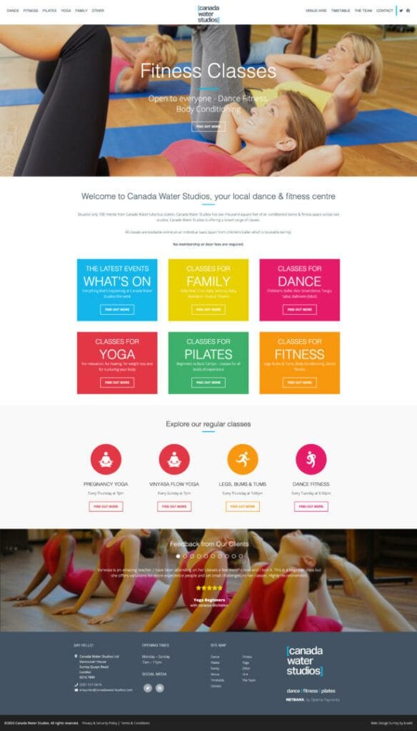 Canada Water Studios is a dynamic dance and fitness centre located just 100 metres from Canada Water tube and bus station. With 2,000 square feet of air-conditioned space across two studios, it offers a diverse range of classes, all easily bookable online. This marks the third major website redesign we’ve completed for Canada Water Studios over the past decade.