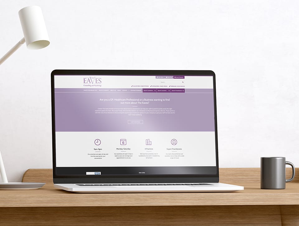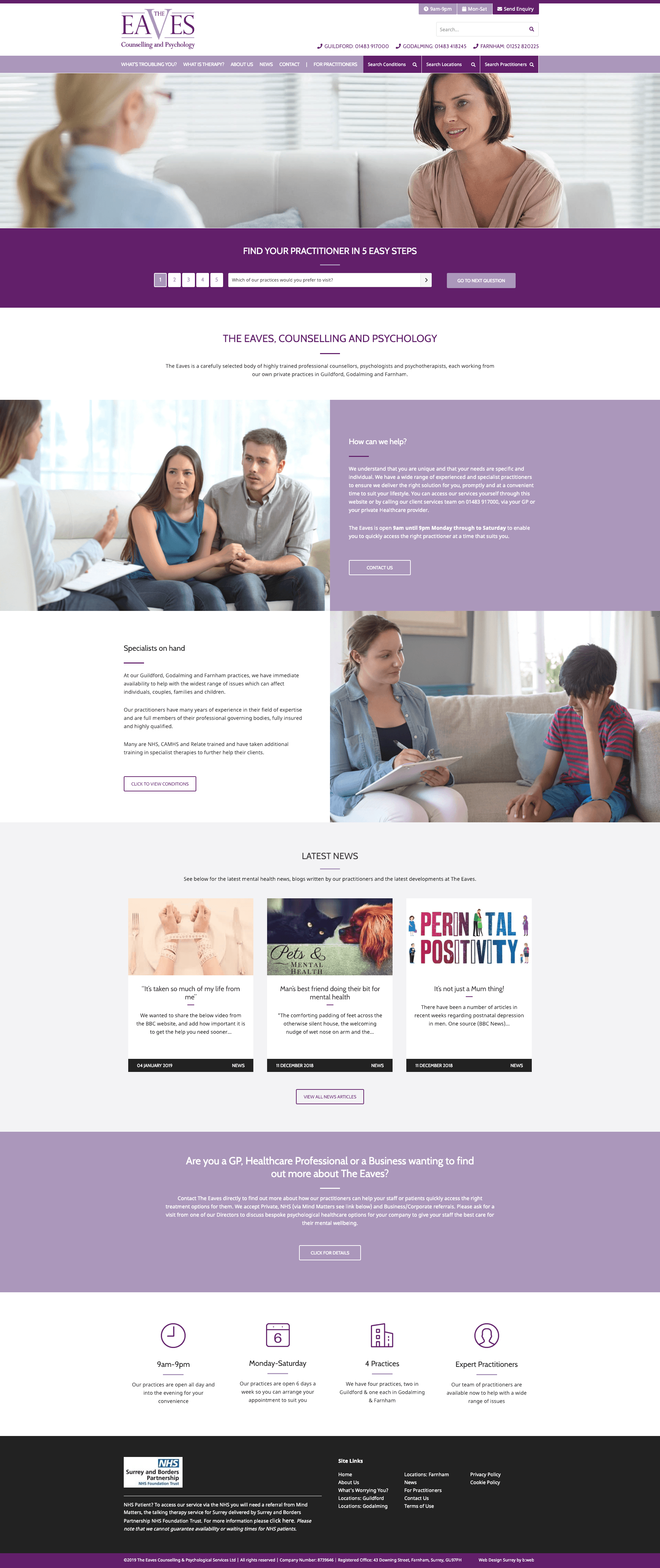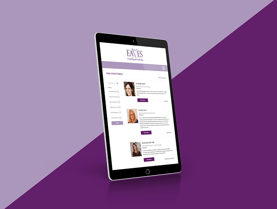 The Eaves – Professional Body of Counsellors, Psychotherapists, and Psychologists, providing mental health support across Surrey and online, needed a website that could serve their growing team of approximately 150 practitioners. These practitioners, ranging from counsellors to psychotherapists and psychologists, each specialised in different therapeutic areas.