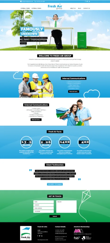 Fresh Air Studios, an award-winning company specialising in audio programmes, podcasts, IVR for telephone systems, commercials, and commentaries for radio, film, and television, needed a website that matched their high standards and complex operational needs. With a diverse client base ranging from global brands like Barclays and Royal Mail to local businesses, Fresh Air required a bespoke content management system (CMS) to assist with their tendering process, avoiding open-source solutions.