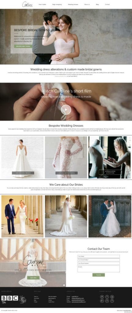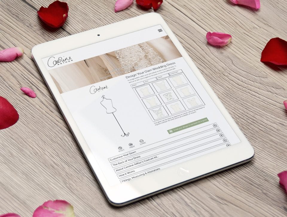 To support Caroline’s “Design Your Own Wedding Dress” service, b:web was engaged to create a bespoke drag-and-drop web app. This feature allows prospective brides to browse the collection and design their own gown by mixing and matching available pieces, finishes, materials, and accessories.